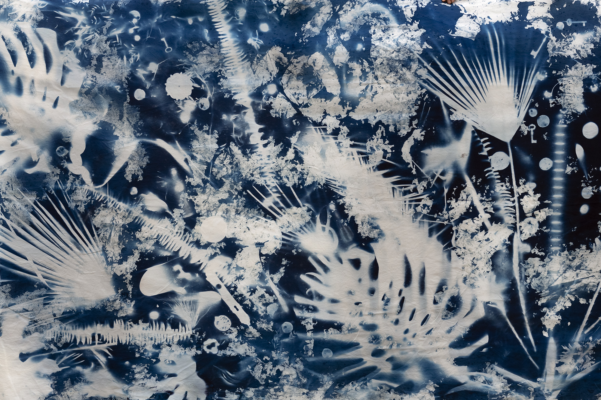 The composition is a poetic dialogue between found objects from the villa and its impressive surrounding gardens. As a large-scale photogram, the work serves as an “index”—a direct physical trace of the location. Upon this canvas, Gru- zei arranged objects found within the villa alongside botanical specimens harvested from the sun-drenched grounds. She used fabric sourced from Genoa, linking the work to the region’s textile history; under the sun, the light etched a permanent Prussian blue into the Genovese fibers.
